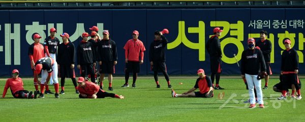 경기 전 KIA 선수들이 외야에서 훈련을 준비하고 있다.