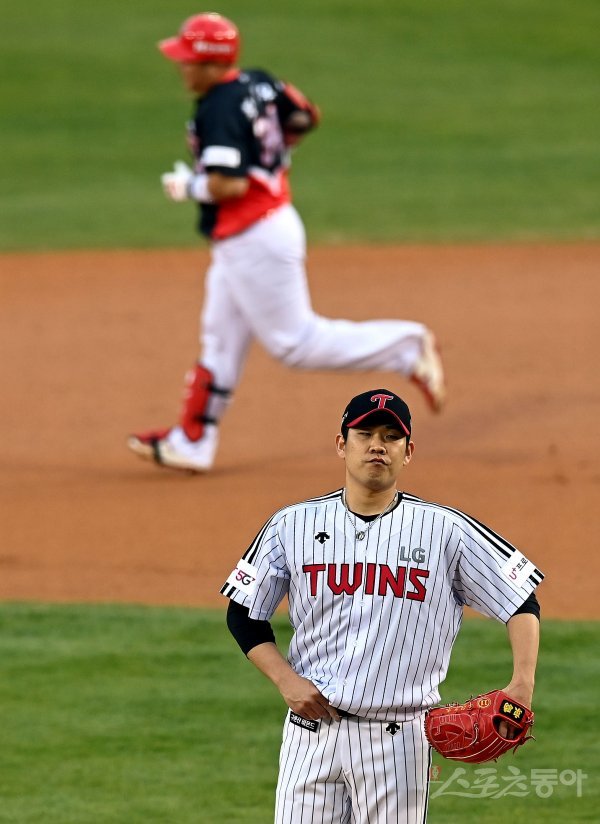 1회초 2사 2루에서 KIA 최형우에게 투런 홈런을 허용한 LG 선발 정찬헌이 아쉬워하고 있다.