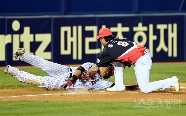 4회말 2사 만루에서 LG 오지환 타석 때 3루 주자 채은성이 투수 견제로 인해 KIA 류지혁에게 태그 아웃되고 있다.