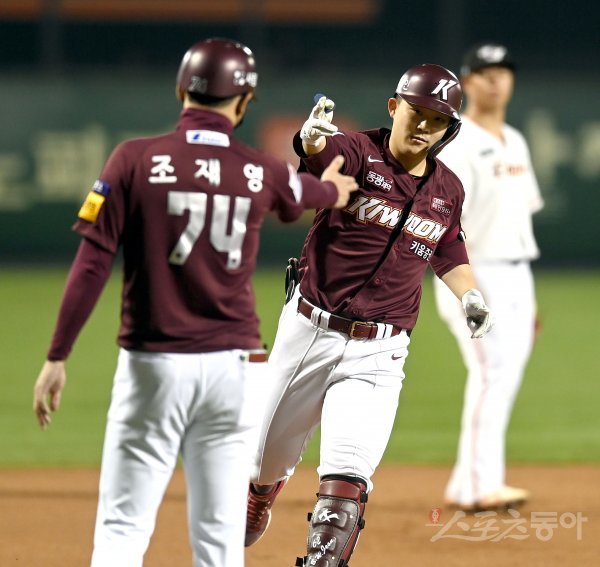 7회초 1사 키움 전병우가 좌월 솔로 홈런을 날리고 그라운드를 돌며 하이파이브 하고 있다.