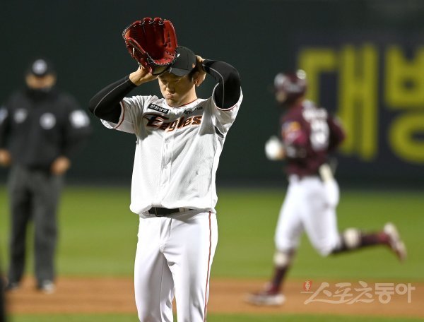 한화 김진영이 7회초 1사 상황에서 홈런을 허용하고 있다.