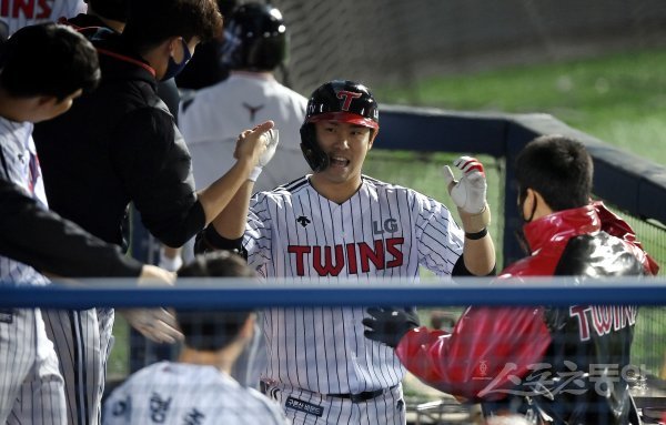 8회말 무사 1루에서 LG 홍창기가 투런 홈런을 쏘아 올린 뒤 동료들의 환영을 받고 있다.
