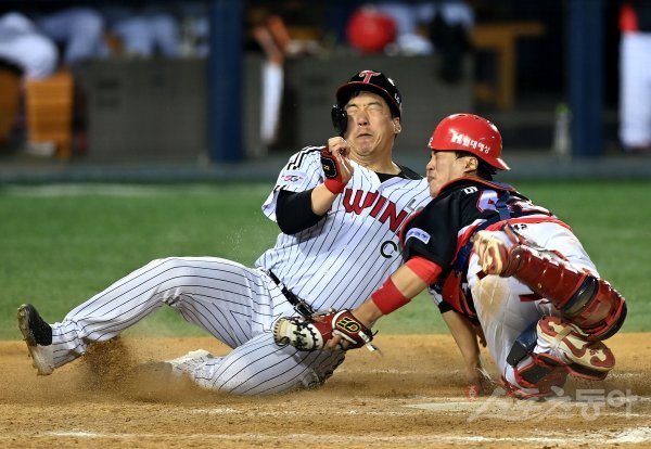 8회말 2사 1, 2루에서 LG 김민성의 안타 때 홈으로 파고들던 김현수가 KIA 한승택에게 태그 아웃되고 있다.