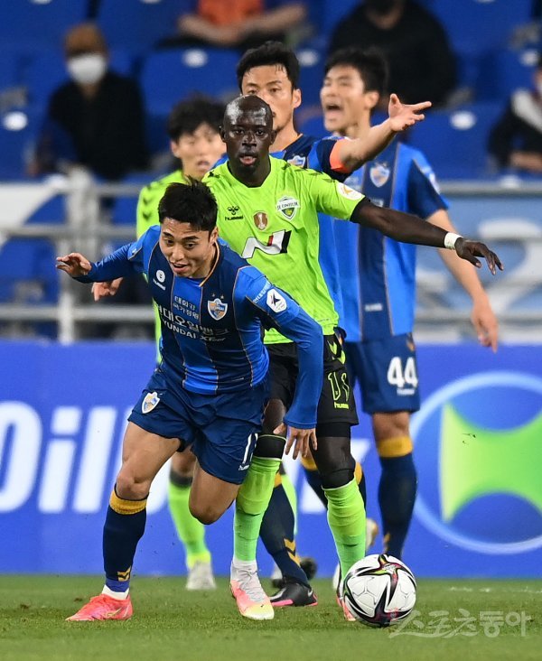 21일 울산 문수축구경기장에서 열린 프로축구 ‘하나원큐 K리그1 2021’ 울산 현대와 전북 현대 경기에서 울산 이동준이 전북 바로우의 수비를 뚫고 공격하고 있다.