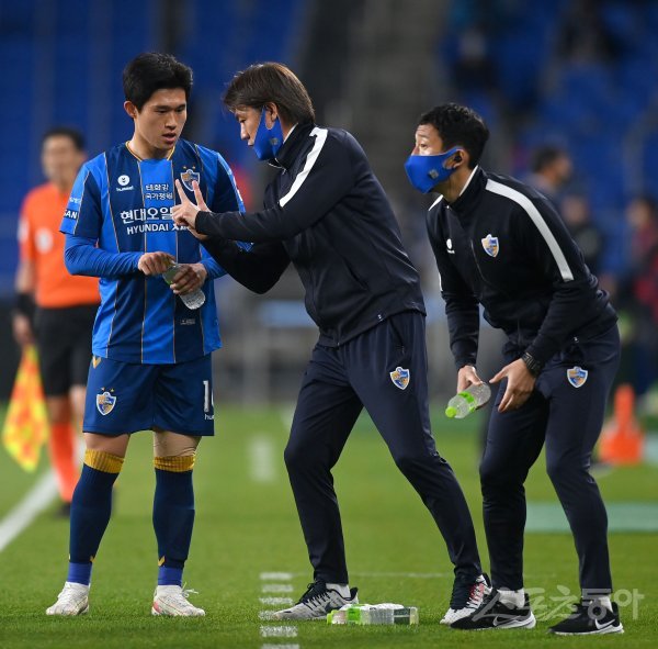 21일 울산 문수축구경기장에서 열린 프로축구 ‘하나원큐 K리그1 2021’ 울산 현대와 전북 현대 경기에서 울산 홍명보 감독이 이동경에게 작전 지시를 하고 있다.