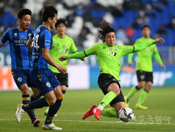 21일 울산 문수축구경기장에서 열린 프로축구 ‘하나원큐 K리그1 2021’ 울산 현대와 전북 현대 경기에서 전북 최보경이 볼을 걷어내고 있다.