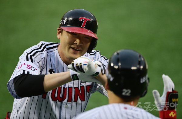 1회말 1사 LG 이형종이 동점 좌전 솔로 홈런을 쳐낸 뒤 동료와 기쁨을 나누고 있다.