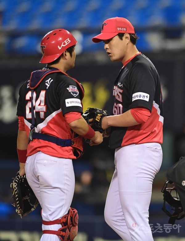5회말 1사 1, 3루 LG의 역전 2루타 때 KIA 고영창이 포수와 이야기를 하고 있다.