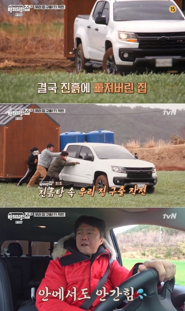 이날 언덕에 도착한 ‘바퀴 달린 집2’ 식구들. 하지만 전날 내린 비로 바닥이 젖은 탓에 바퀴가 진흙에 빠져버렸다. 결국 스태프까지 동원돼 다 같이 차를 끌었고 겨우 탈출할 수 있었다.