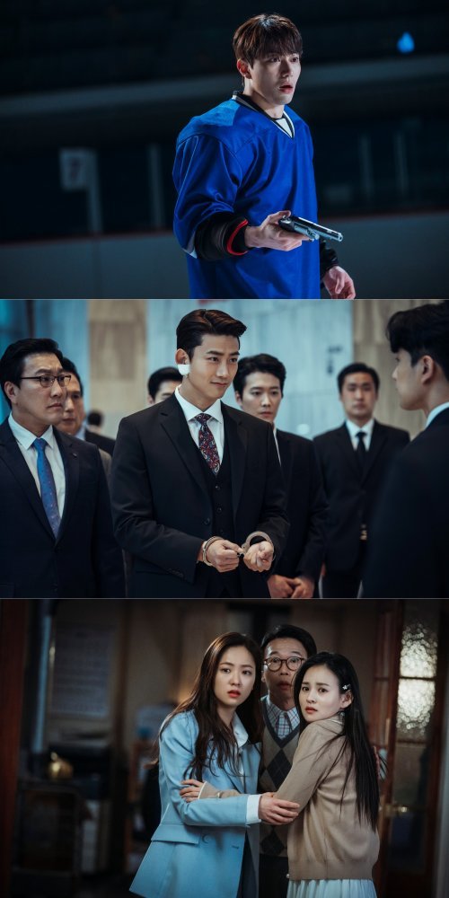 그런 가운데 공개된 사진 속 장준우에게 일어난 사건 역시 호기심을 증폭한다. 중역들이 보는 자리에서 체포되는 장준우. 수갑을 차고서도 여유롭게 웃는 그의 모습은 감춰진 꿍꿍이가 있음을 짐작게 한다. 그런가 하면 금가프라자에는 위기의 그림자가 드리워졌다. 잔뜩 겁먹은 표정으로 어딘가를 응시하는 서미리 원장의 곁으로 그를 보호하는 홍차영의 모습이 포착됐다. 홍차영과 남주성 사무장의 시선 끝엔 무엇이 있을지, 두 사람의 놀란 얼굴이 궁금증을 끌어올린다.