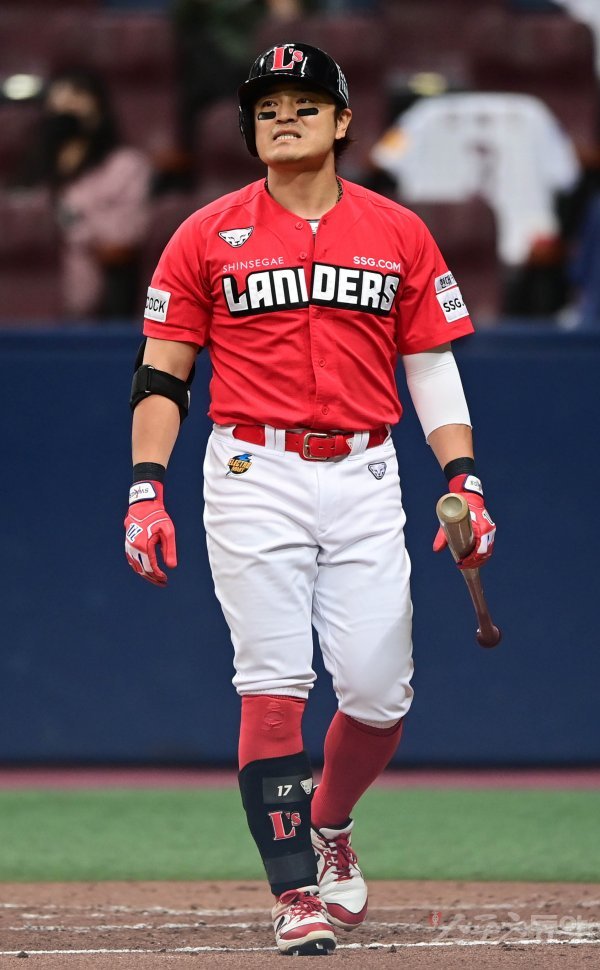 25일 고척스카이돔에서 ‘2021 신한은행 SOL KBO리그’ 키움 히어로즈와 SSG 랜더스의 경기가 열렸다. 3회초 1사 2, 3루 SSG 추신수가 삼진 아웃을 당한 뒤 아쉬워하고 있다.