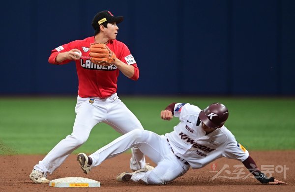 25일 고척스카이돔에서 ‘2021 신한은행 SOL KBO리그’ 키움 히어로즈와 SSG 랜더스의 경기가 열렸다. 4회초 1사 1루 키움의 내야 땅볼 때 SSG 유격수 박성한이 1루주자를 포스 아웃시킨 뒤 1루로 송구하고 있다.
