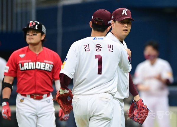 25일 고척스카이돔에서 ‘2021 신한은행 SOL KBO리그’ 키움 히어로즈와 SSG 랜더스의 경기가 열렸다. 6회초 수비를 마친 뒤 키움 양현이 김웅빈과 기쁨을 나누고 있다.