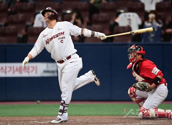 25일 고척스카이돔에서 ‘2021 신한은행 SOL KBO리그’ 키움 히어로즈와 SSG 랜더스의 경기가 열렸다. 6회말 2사 만루 키움 박병호가 헛스윙 삼진 아웃을 당하고 있다.