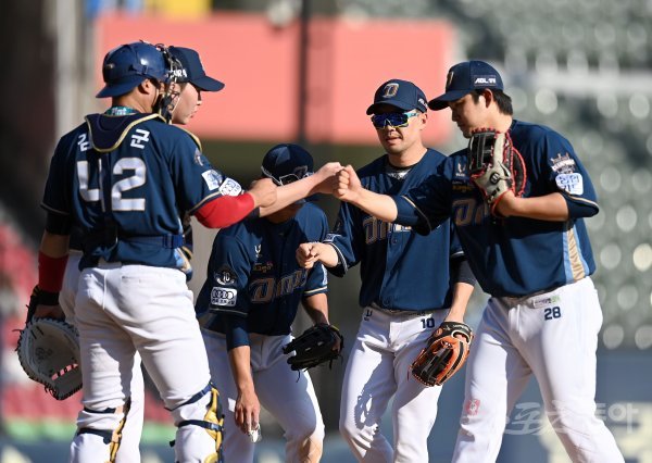 10-0 승리를 거두며 3연패에서 탈출한 NC 선수들이 하이파이브 하고 있다.
