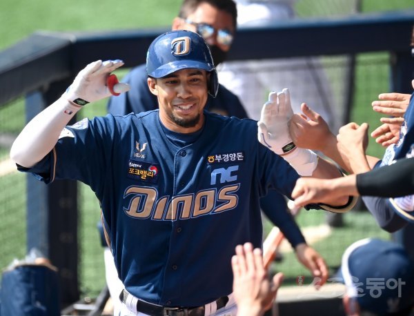 3회초 무사 NC 알테어가 좌월 솔로 홈런을 날리고 그라운드를 돌아 홈인해 하이파이브 하고 있다.