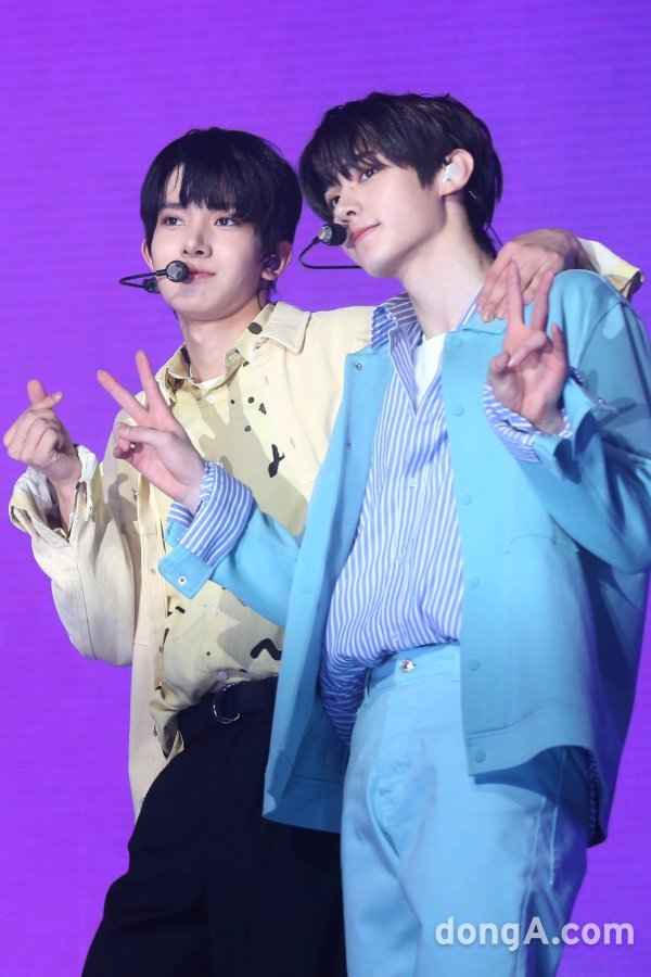 그룹 엔하이픈의 희승(왼쪽)과 성훈이 26일 오후 서울 용산구 블루스퀘어에서 열린 두 번째 미니앨범 \'보더 :카니발\' 발매 쇼케이스에서 새로운 무대를 선보이고 있다.