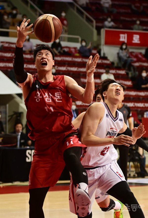 26일 안양실내체육관에서 열린 ‘2020-2021 현대모비스 프로농구’ 4강 플레이오프 3차전 안양 KGC와 울산 현대모비스의 경기에서 KGC 양희종이 현대모비스 김민구의 앞에서 루즈볼을 잡고 있다.
