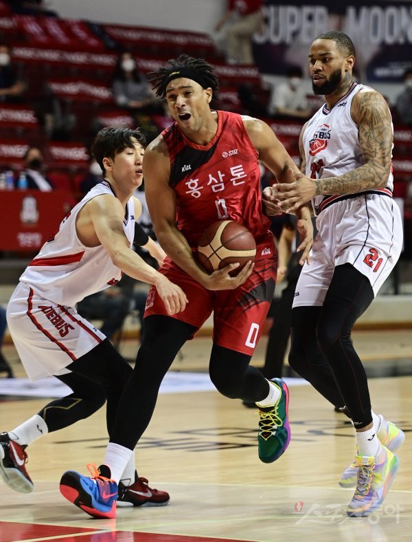 26일 안양실내체육관에서 열린 ‘2020-2021 현대모비스 프로농구’ 4강 플레이오프 3차전 안양 KGC와 울산 현대모비스의 경기에서 KGC 설린저가 현대모비스의 수비를 뚫고 골밑 돌파하고 있다.