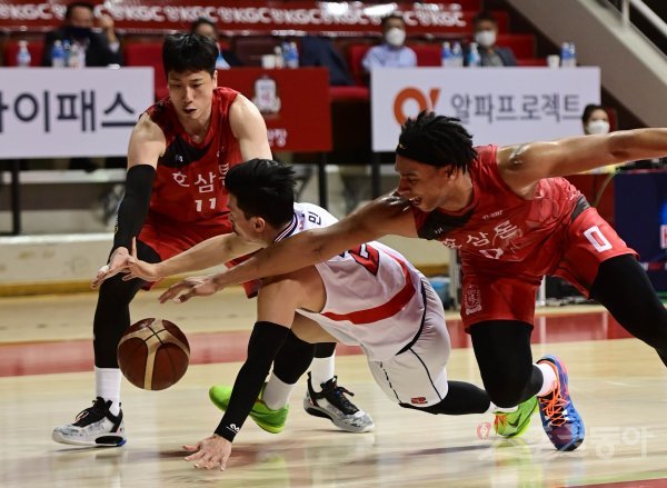 26일 안양실내체육관에서 열린 ‘2020-2021 현대모비스 프로농구’ 4강 플레이오프 3차전 안양 KGC와 울산 현대모비스의 경기에서 현대모비스 이현민과 KGC 설린저가 루즈볼을 향해 몸을 던지고 있다.