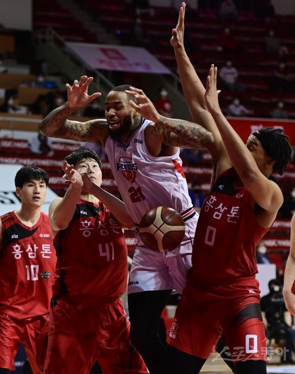 26일 안양실내체육관에서 열린 ‘2020-2021 현대모비스 프로농구’ 4강 플레이오프 3차전 안양 KGC와 울산 현대모비스의 경기에서 현대모비스 숀롱이 슈팅 과정에서 볼을 놓치고 있다.