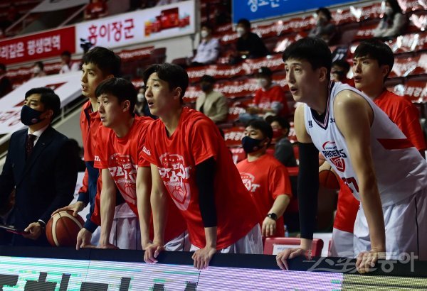 26일 안양실내체육관에서 열린 ‘2020-2021 현대모비스 프로농구’ 4강 플레이오프 3차전 안양 KGC와 울산 현대모비스의 경기에서 현대모비스 선수들이 실점에 아쉬워하고 있다.