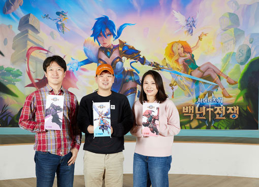 컴투스의 기대작 ‘서머너즈 워: 백년전쟁’을 만든 사람들. 오영학 사업실장, 이승민 개발 스튜디오장, 장순영 아트 팀장(왼쪽부터)은 글로벌 흥행을 확신하며 “친구와 함께하면 더 재미있게 즐길 수 있을 것”이라고 했다. 사진제공|컴투스