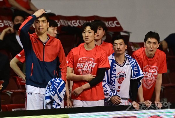 26일 안양실내체육관에서 열린 ‘2020-2021 현대모비스 프로농구’ 4강 플레이오프 3차전 안양 KGC와 울산 현대모비스의 경기에서 현대모비스 선수들이 벤치에서 실점에 아쉬워하고 있다.