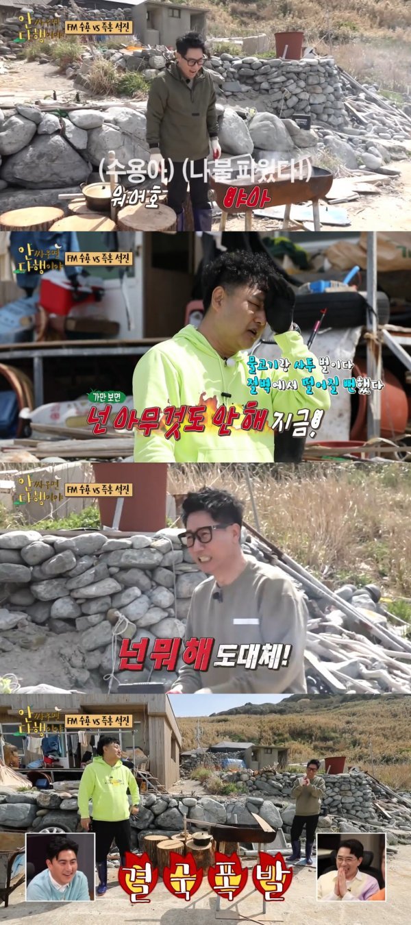 단둘이 찾아간 섬에서 그동안 몰랐던 서로의 \'고집\'을 발견하며 불꽃 튀는 설전을 보여준 지석진과 김수용. 원칙대로 움직이는 FM 수용과 즉흥적으로 움직이길 원하는 석진, 두 사람의 황소고집에 처음 \'30년 우정\'이 위기를 맞이했다. 여기에 두 사람은 문어와 낙지를 잡겠다고 호미를 집어 들고, 냄비 밥에 청양고추를 썰어 넣는 등 역대급 \'자연 무식자\' 면모와 함께 제대로 \'짠내 케미\'를 선사하며 눈길을 사로잡았다.
