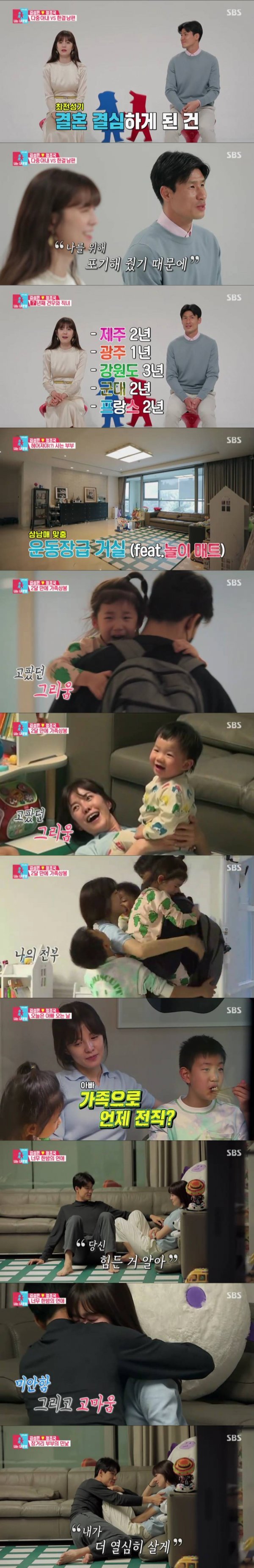 또 두 사람은 결혼 13년 동안 줄곧 장거리 부부로 지내다 보니 “정작 같이 산 기간은 3년”이라고 밝혀 눈길을 끌었다. 이어 각자 서울과 제주에서 지내고 있는 두 사람의 일상이 공개됐다. 정조국이 축구선수 은퇴 후 제주에서 코치로 활동 중이기 때문. 김성은은 아침부터 삼남매 육아로 그야말로 정신없는 하루를 보냈다. 그런 와중 열두 살 첫째 아들 태하는 다섯 살, 14개월 동생 둘을 돌보며 엄마 김성은을 도와 감탄을 자아냈다. 한편, 정조국은 장거리 결혼생활에 대해 “’외롭다’라기보다는 그리움이 굉장히 크다. 한 해 한 해 지날수록 더 커지고 힘든 것 같다”라고 털어놨다.