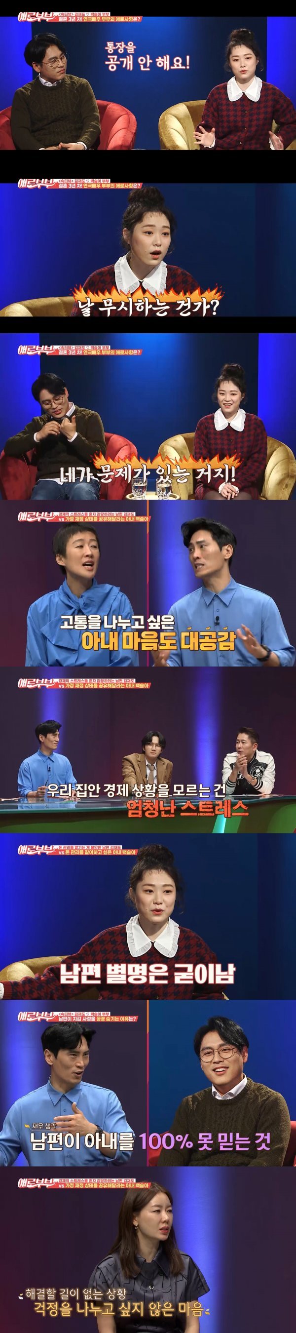 이 상황에 아내는 “매번 뭘 사려면 남편에게 돈을 받아 써야 하니 자존감이 떨어진다. 진심을 담아 편지까지 써 봤는데 답이 없다”며 한숨을 쉬었다. 그러나 남편 역시 “코로나 19로 공연 무대가 거의 없어 이사 청소업을 하며 돈을 벌고 있다”며 “극단적인 선택을 하는 가장들의 뉴스가 이해 가기도 한다”며 고충을 토로했다.