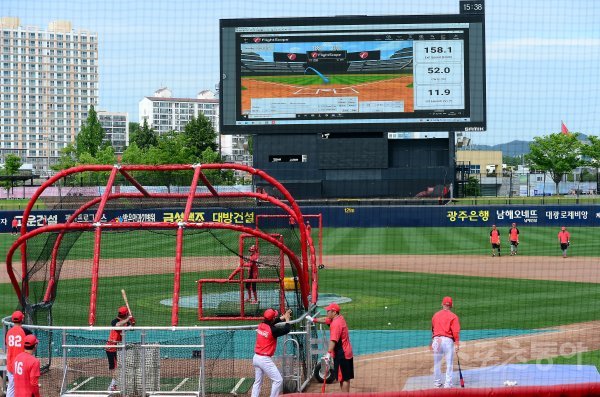 경기 전 전광판을 통해 KIA 타자들의 배팅 정보가 표시되고 있다.