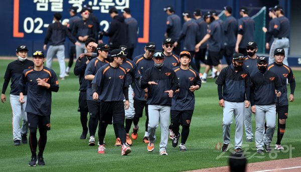 경기 전 한화 선수들이 스트레칭 훈련을 마치고 더그아웃으로 향하고 있다.