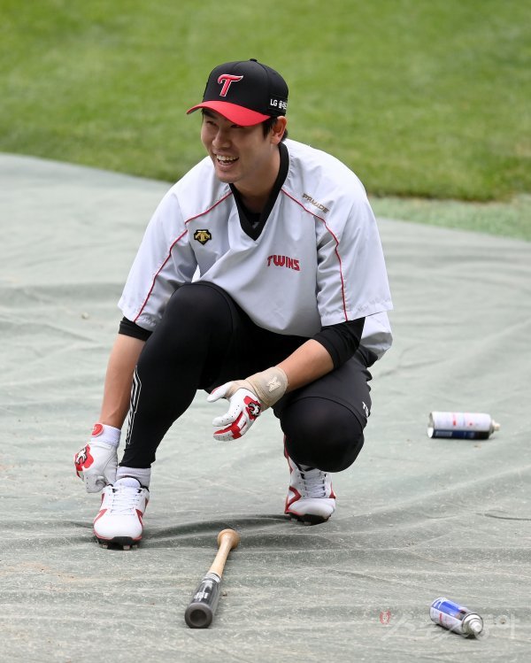 LG 홍창기가 훈련 중 밝게 웃고 있다.