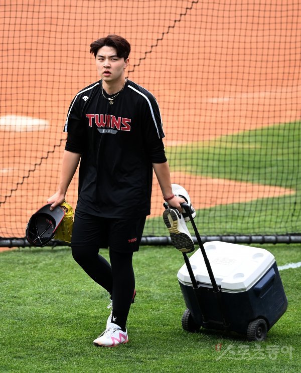 훈련을 마친 LG 이민호가 더그아웃으로 향하고 있다.