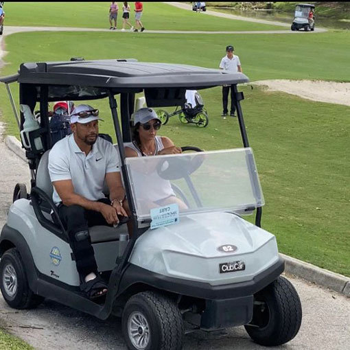 지난 2월 자신이 운전하던 차량의 전복 사고로 다리를 심하게 다쳤던 ‘골프 황제’ 타이거 우즈(미국)가 사고 이후 처음으로 골프장에서 나타난 모습이 포착됐다. 우즈의 팬들이 만든 ‘TW스폿(TWSPOT)’이라는 소셜 미디어 계정에는 우즈가 카트를 타고 이동하는 사진이 올라왔다. 골프닷컴도 27일(한국시간) 이 사진을 소개하며 “우즈가 지난 주말 플로리다주 웨스트 팜비치의 PGA 내셔널골프클럽에서 열린 허리케인 주니어골프 대회에 출전한 아들 찰리를 보기 위해 나타났다”며 “연인 에리카 허먼이 카트를 운전하고 우즈는 옆자리에 동승했다”고 전했다. 우즈는 오른쪽 다리에 보호대를 착용한 채 카트에 타고 있고, 목발은 보이지 않아 어느 정도 일상생활이 가능한 게 아니냐는 추측을 낳았다.