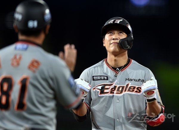 4회초 1사 2, 3루에서 한화 김민하가 2타점 역전 적시타를 날린 뒤 세리머니를 펼치고 있다.