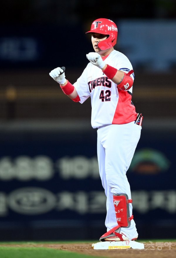 4회말 1사 2루에서 KIA 한승택이 1타점 2루타를 날린 뒤 환호하고 있다.