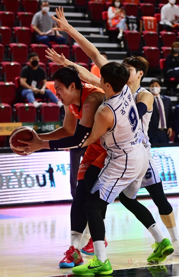 27일 인천 삼산월드체육관에서 열린 ‘2020-2021 현대모비스 프로농구’ 4강 플레이오프 4차전 인천 전자랜드와 전주 KCC의 경기에서 전자랜드 정효근이 KCC의 수비에 볼을 놓치고 있다.