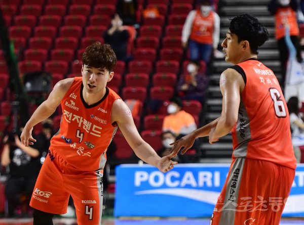 27일 인천 삼산월드체육관에서 열린 ‘2020-2021 현대모비스 프로농구’ 4강 플레이오프 4차전 인천 전자랜드와 전주 KCC의 경기에서 전자랜드 김낙현과 차바위가 득점에 성공한 후 기쁨을 나누고 있다.