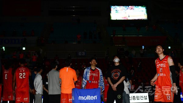27일 인천 삼산월드체육관에서 열린 ‘2020-2021 현대모비스 프로농구’ 4강 플레이오프 4차전 인천 전자랜드와 전주 KCC의 경기에서 전자랜드가 KCC에 94-73으로 승리를 거둔 뒤 선수들이 기념 영상을 보고 있다.