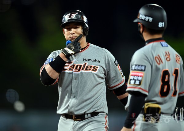 7회초 2사에서 한화 최재훈이 안타를 날린 뒤 세리머니를 펼치고 있다.
