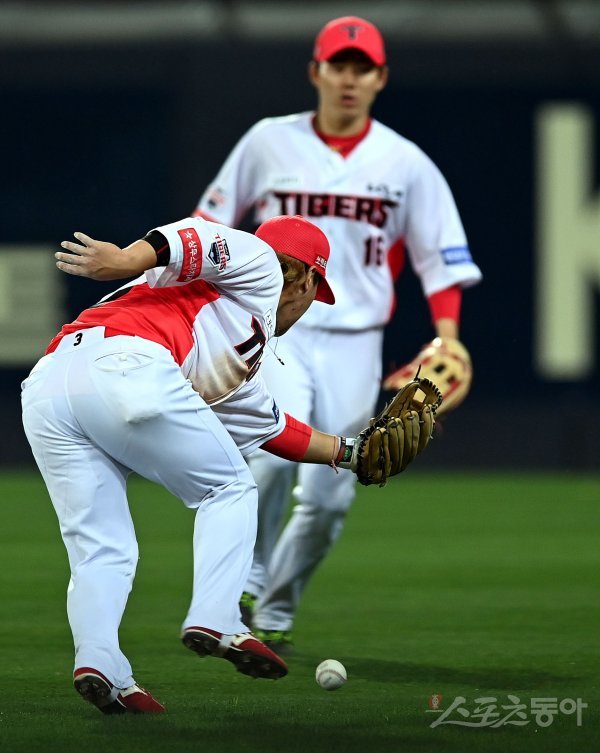 8회초 2사 1루에서 한화 힐리의 안타 타구를 KIA 김선빈이 따라갔으나 볼을 잡았다가 빠뜨리고 있다.