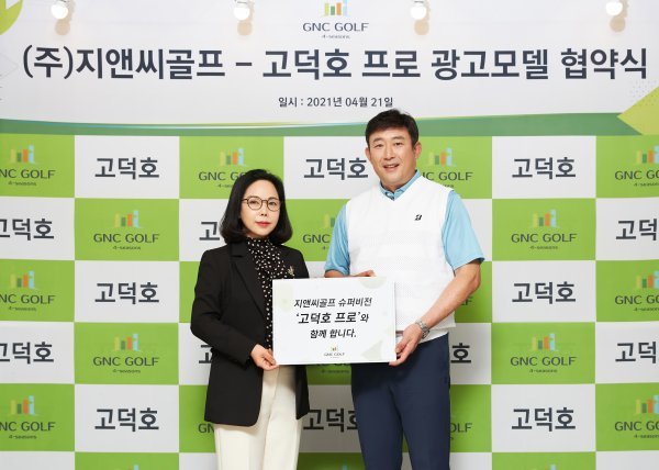 ㈜지앤씨골프 송경화 이사장(왼쪽)이 고덕호 프로와 광고 모델 협약식을 가진 뒤 포즈를 취하고 있다.
