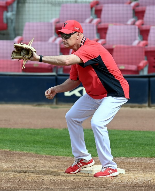 경기 전 KIA 윌리엄스 감독이 1루수로 나서며 선수들의 훈련을 돕고 있다.