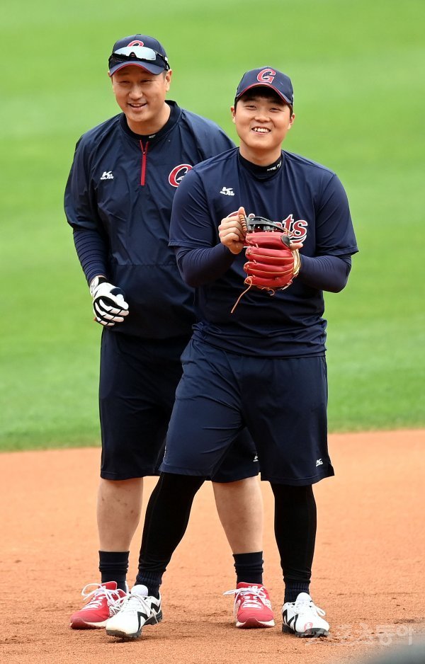 롯데 이대호와 한동희가 이야기를 나누고 있다.
