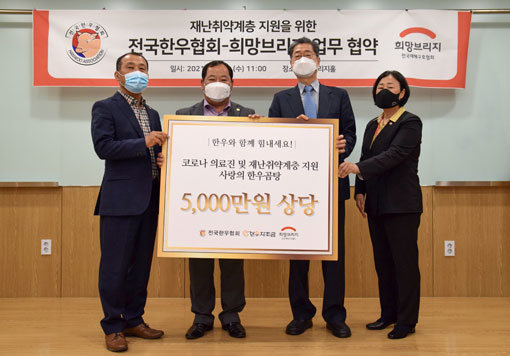 희망브리지 전국재해구호협회가 전국한우협회와 손잡고 재난 취약계층을 돕는다.두 기관은 28일 서울 마포구 신수동 전국재해구호협회에서 송필호 희망브리지 회장, 김정희 사무총장, 김삼주 전국한우협회장, 한양수 부회장 등이 참석한 가운데 업무협약을 체결했다. 전국한우협회가 기부하는 현금이나 현물을 희망브리지가 재난 취약계층, 구호업무 종사자 등에게 전달하는 것이 주요 내용이다. 전국한우협회는 이날 업무협약과 함께 신종 코로나바이러스 감염증(코로나19) 의료진과 재난 취약계층을 위해 써달라며 희망브리지에 한우 곰탕 5000만 원 상당도 전달했다.
