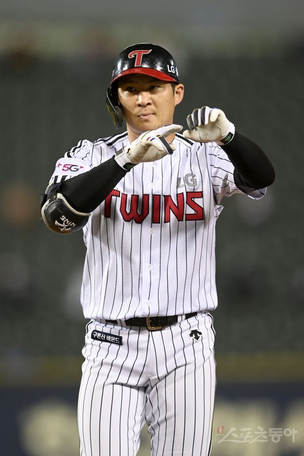 6회말 1사 LG 오지환이 우전 안타를 치고 1루에서 기뻐하고 있다.