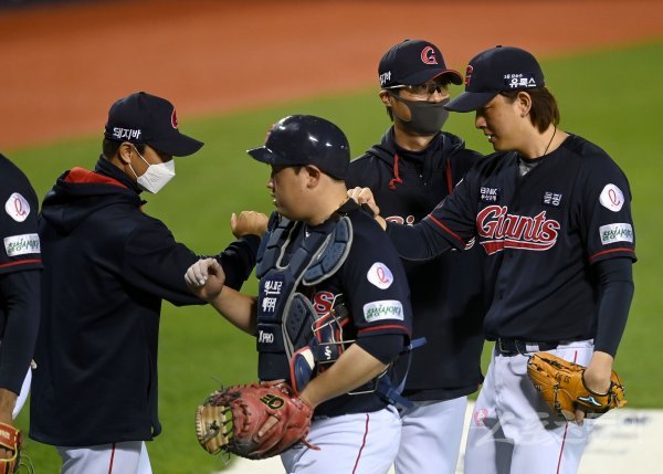 3-0 승리를 거둔 롯데 허문회 감독이 김원중과 하이파이브 하고 있다.
