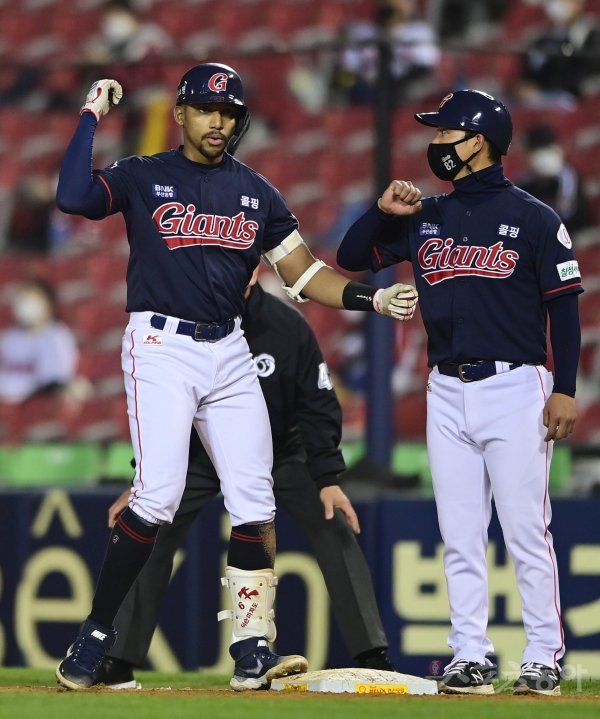 5회초 무사 롯데 마차도가 안타를 쳐낸 뒤 더그아웃을 향해 세리머니하고 있다.
